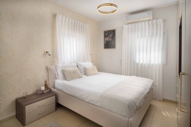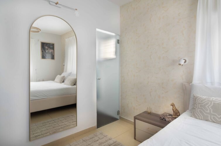 בחדר השינה הבקשה הייתה לייצר תחושה של חדר מלון, ורוב התקציב נותב לחדר שינה מפנק, מעוצב בצבעים בהירים אך עם זאת חמימים, כדי לייצר תחושת מרווח בחדר ועדיין לייצר אווירה יוקרתית, לטובת זאת נבחר טפט ופירזול זהב עדין שקושר את כל פרטי הנגרות בצורה אלגנטית ונעימה למראה. ההרמוניה שולטת, לכל דבר נמצא מקום והלקוחות מרוצים